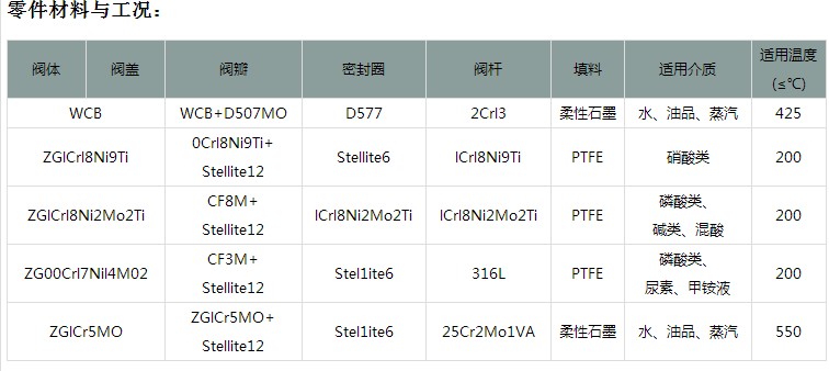 6、閥體材料品種齊全,填料、墊片可根據實際工況或用戶要求合理選配,能適用于各種壓力、溫度及介質工況。
