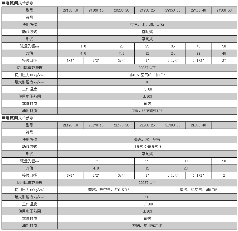 2W系列電磁閥,閥體采用鍛壓成型,內件不銹鋼制作,用于管路中對液體,氣體介質通斷的自動控制。兩口兩位直動式電磁閥,斷電打開,通電關閉閥體材質為銅,最大耐壓使作壓力:17kgf/cm2環境溫度:0℃~65℃產品系列化生產,體積小,流量大,適用范圍廣按閥上所表流向箭頭,可任意安裝;為增強使用壽命,最好線圈向上,水平安裝。